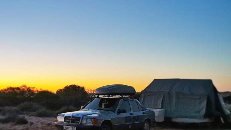 Morda gre na prvi pogled za malce nenavaden »par«, a kot pravita Melanie in Stefana je kombinacija »vintage« Mercedes-Benza 190 in »mlade« Camp-let šotorske prikolice optimalna. »V svojega oldtimerja sem se zaljubil še v času, ko smo s starimi avtomobili potovali od Pariza do Dakarja in kljub temu, da ima avto že kar nekaj kilometrov za sabo, me še ni pustil na cedilu,« pravi 47-letni Avstrijec, ki odgovarja tudi, zakaj šotorska prikolica?: "Lahka je za vleko, z veliko prostora za vso kamp opremo, hitro postavljena in pripravljena za spanje, kuhanje ali pa samo za počitek v zavetju močnega baldahina po napornem dnevu." S camp-letko sta kampirala v gorah, džungli ali puščavi, v vseh vremenskih okoliščinah in kot pravi, ju še ni razočarala.