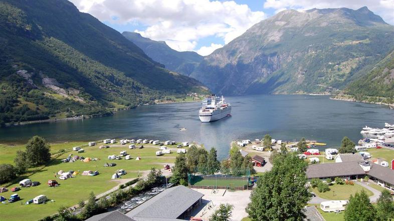 Sonce naju je obdarilo tudi v Geirangerju. To je ena od lokacij, ki sva si jih pri načrtovanju potovanja v Skandinavijo od vseh najprej podčrtala. Že ob pogledu iz šotora sva doživela pogled, ki sva ga videla na razglednicah. V fjordu se je namreč zasidrala prva ladja križarka. Vsak dan v fjord prispeta vsaj dve križarki, ki na obalo izkrcata na tisoče turistov, ti pa okupirajo restavracije in trgovine s spominki.