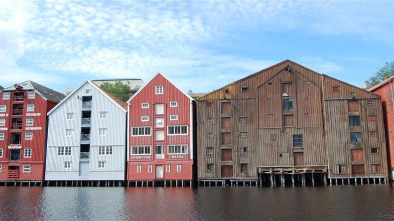 Le streljaj od najinega parkirišča na glavni avtobusni postaji v Trondheimu do centra mesta vodijo mostički. Trondheim naju je očaral na prvi pogled, pa še nebo se je odprlo nad mestom. V mestu kar mrgoli ozkih ulic, obdanih z raznobarvnimi majhnimi, v les oblečenimi hiškami, ki je vsaka zase unikat. Posebnost tretjega največjega norveškega mesta z nekaj več kot sto tisoč prebivalci mesta so stare hiše, ki na lesenih kolih štrlijo iz vode. Ob morskih rokavih so parkirane drage jahte, ki jih domačini uporabljajo za vsakodnevni prevoz. Posebej naju je očarala katedrala, ki je mogočna in veličastna. Za ogled mesta sva si vzela le tri ure časa, kar je dovolj za sprehod okoli največjih znamenitosti, če imate čas, pa si le vzemite ves dan. Priporočava.