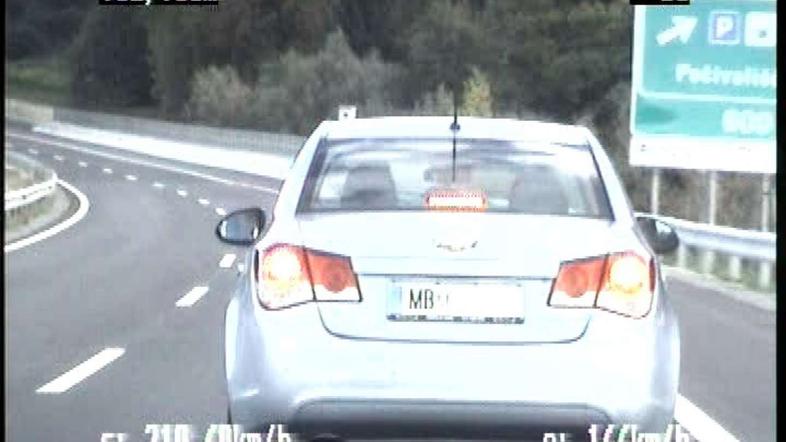 Policisti so hitrost chevrolet cruza izmerili v ponedeljek popoldne na avtocestnem odseku med Drnovim in Obrežjem vozniku. 210,4 km/h je bila po zapisniku policistov povprečna hitrost, kar pomeni, da je bila največja hitrost še precej večja. Za volanom je sedel 21-letnik. Kršitelja so policisti ustavili, izločili iz prometa, mu prepovedali nadaljnjo vožnjo in odvzeli vozniško dovoljenje, so sporočili iz Policijske uprave Novo mesto.