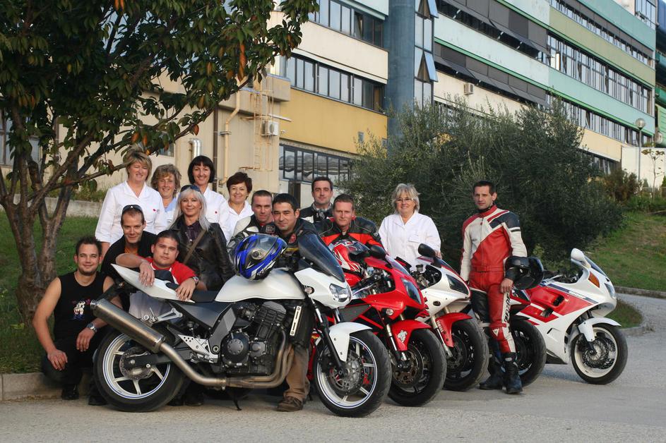 Skupinska fotografija motoristov in osebja izolske bolnišnice