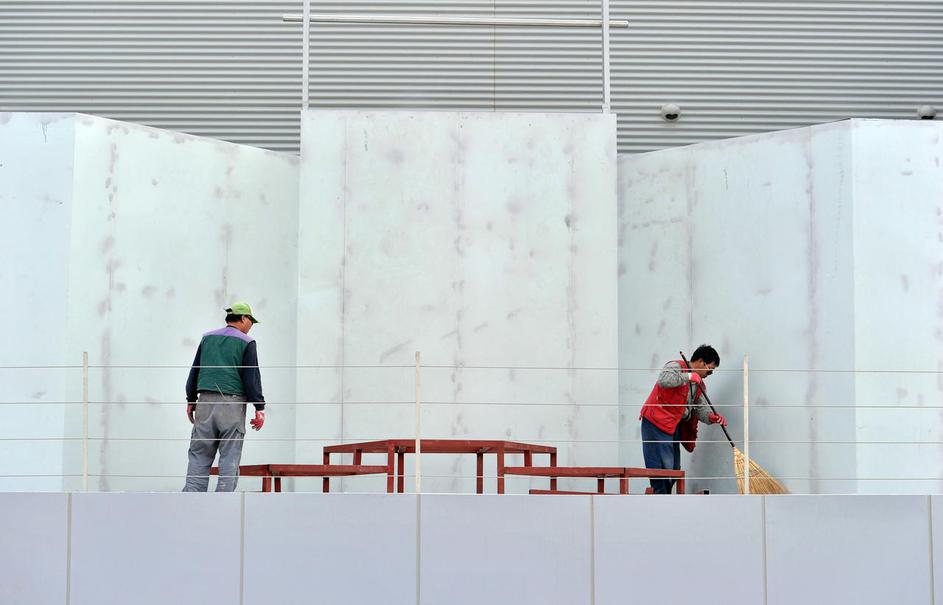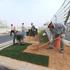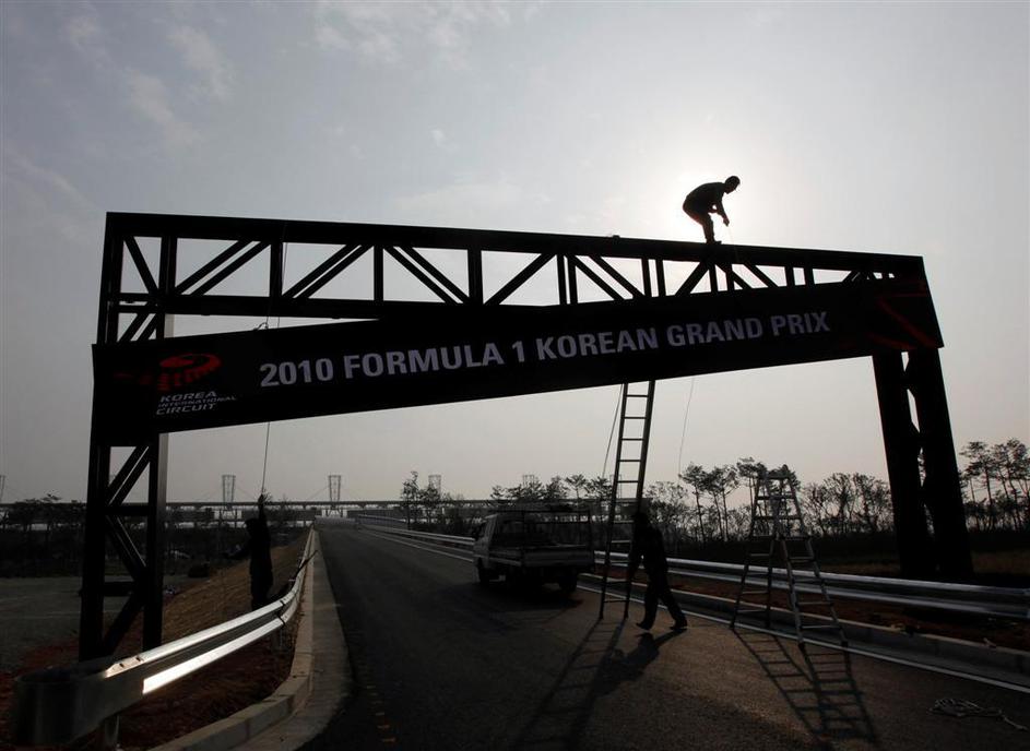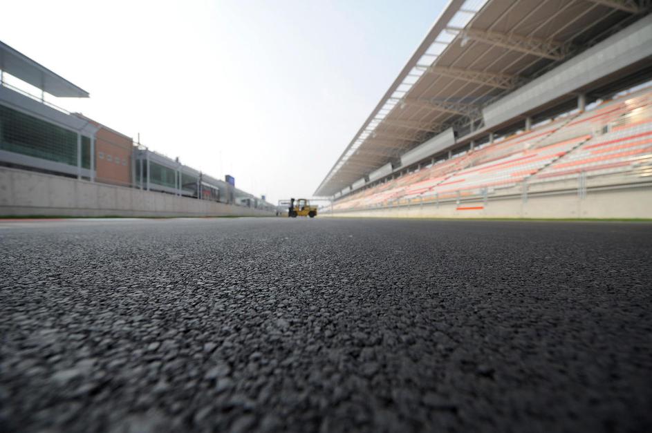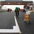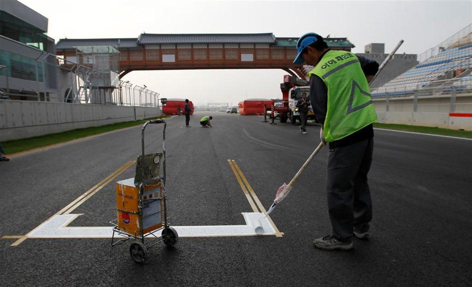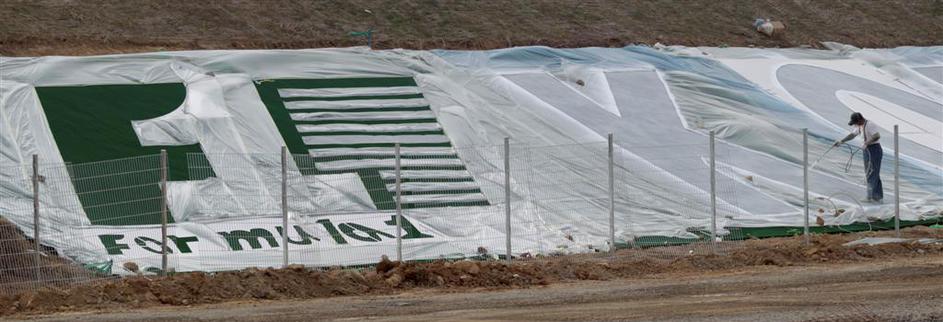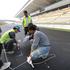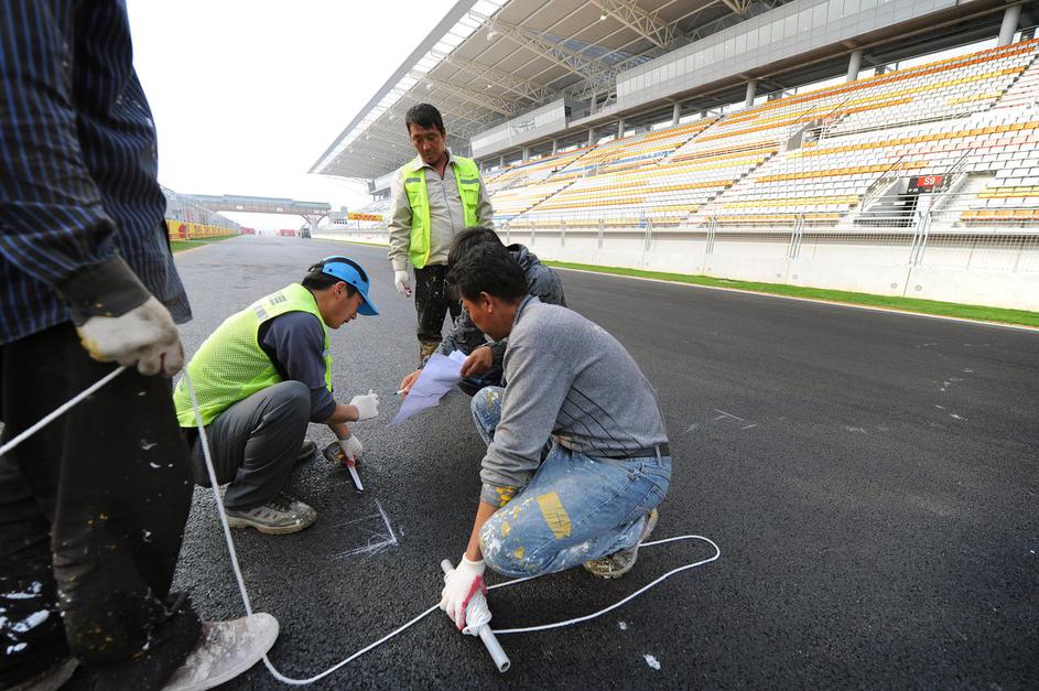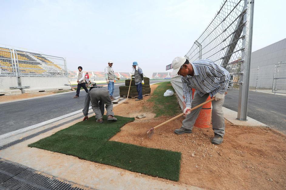 Dva dni pred prvim treningom delavci polagajo travo ob progi, zarisujejo startna mesta, obešajo rekl