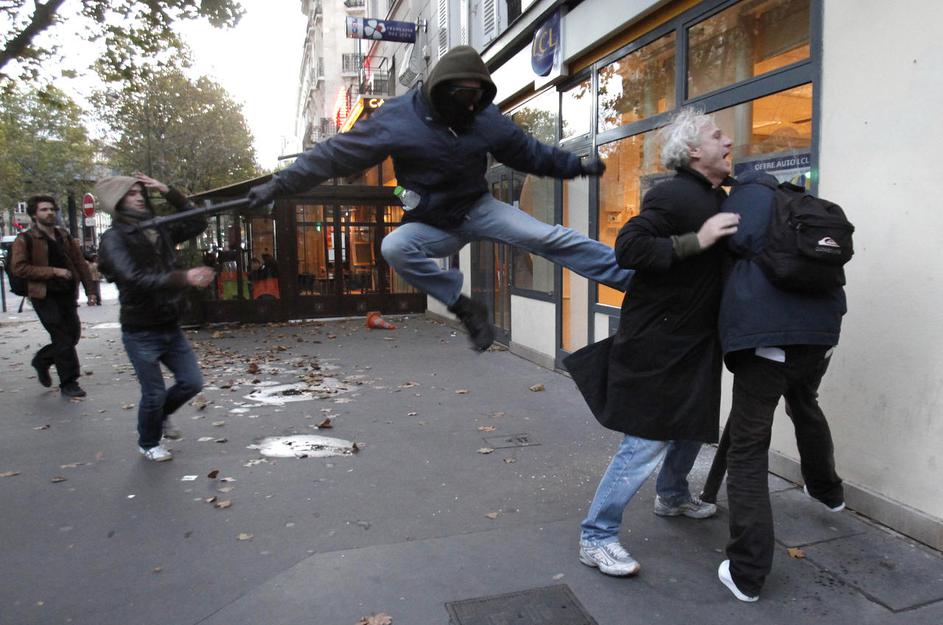 Napad protestnikov na mimoidočega med demonstracijami oktobra 2010 v Parizu.