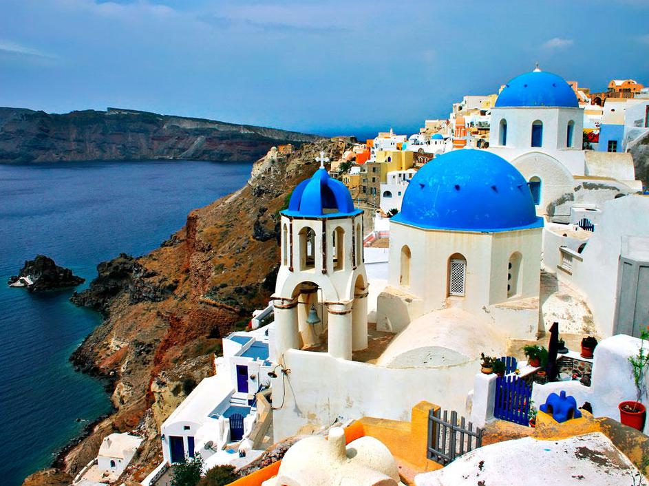 Santorini, Grčija. Verjetno najbolj razvpit grški otok se na treh straneh strmo spušča v morje. Na n