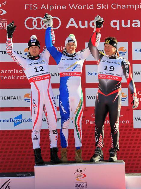 Najboljši trije na superveleslalomu: drugi Reichelt, prvi Innerhofer in tretji Kostelić.