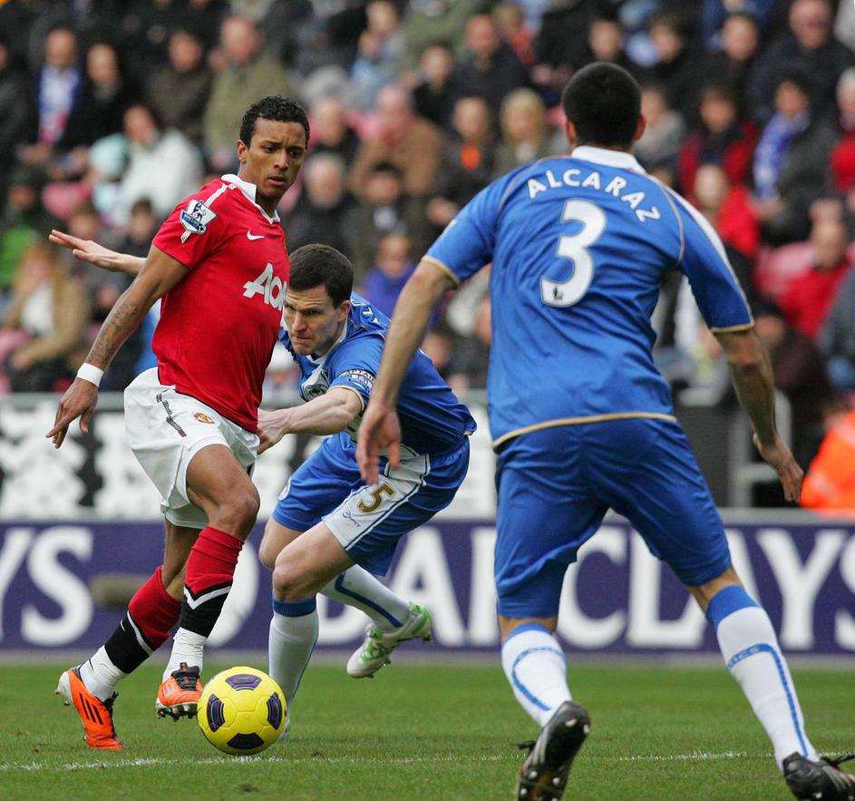 (Wigan Athletic - Manchester United) Nani in Gary Caldwell.
