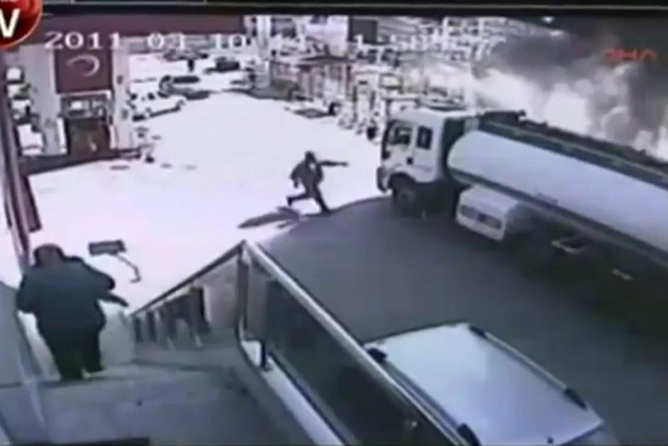 Gorečo cisterno odpeljal s črpalke