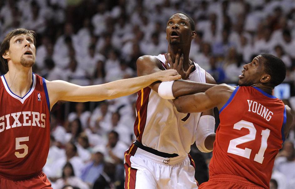 Chris Bosh je odigral tekmo sezone in Heat so s 97:89 zanesljivo premagali 76ers in povedli z 1:0.