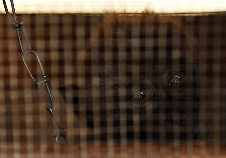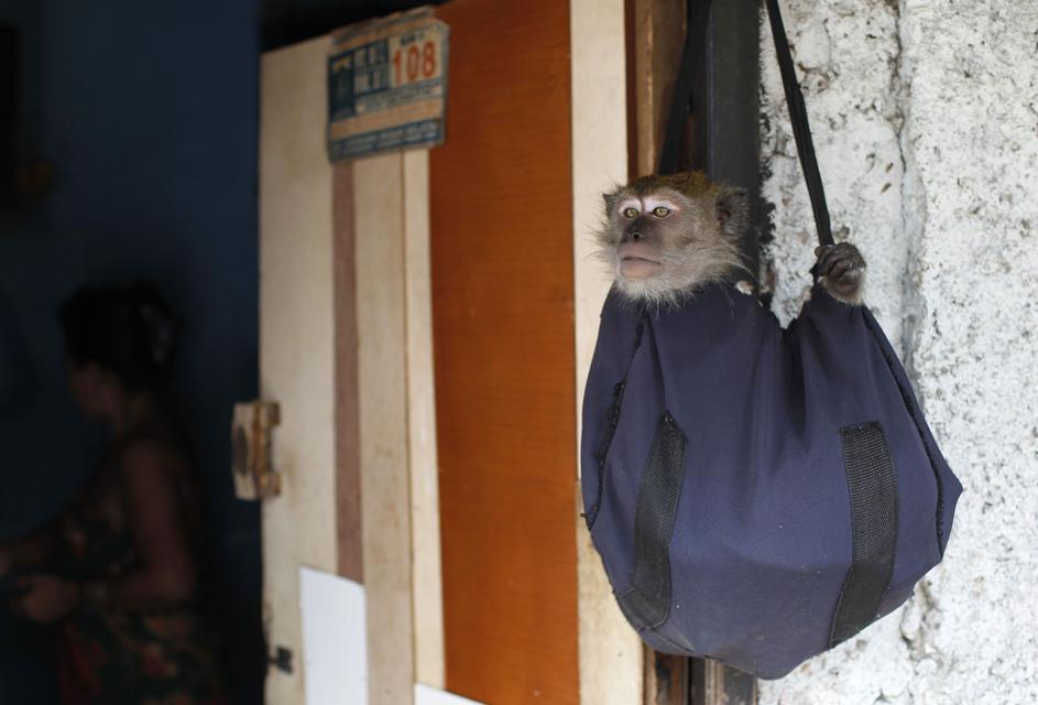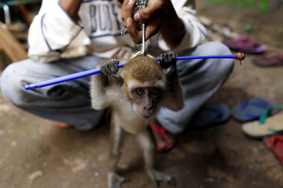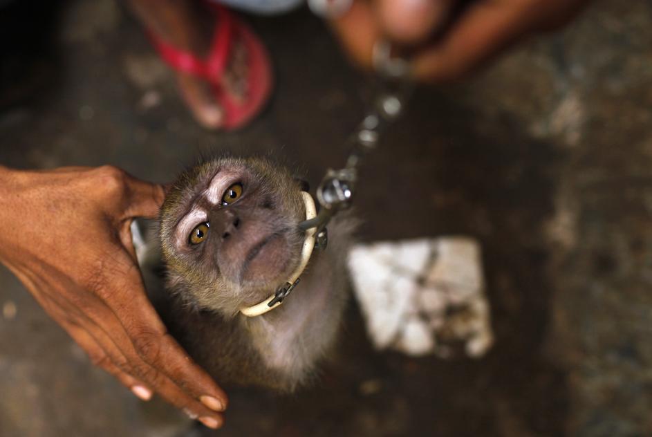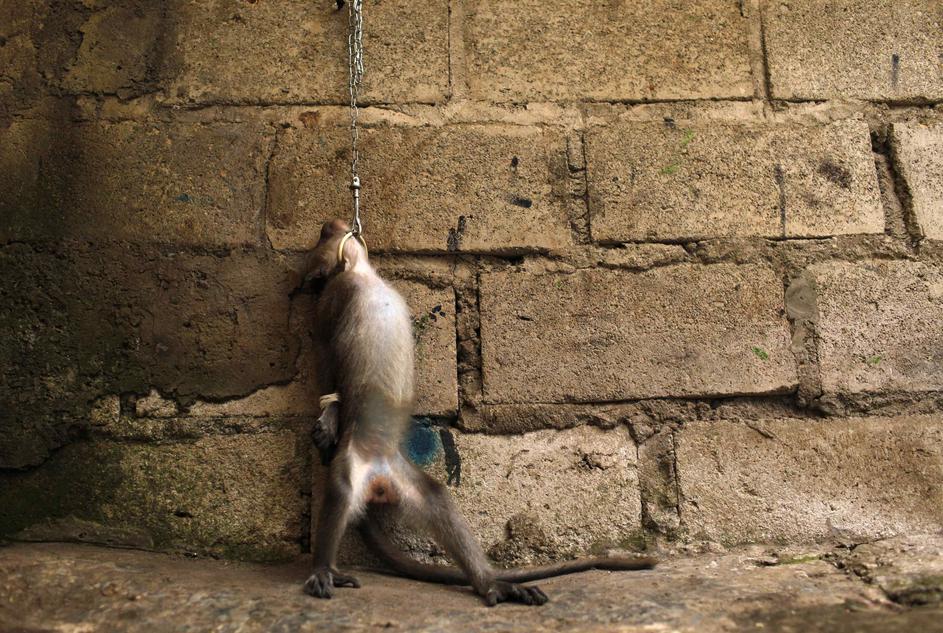 Med čakanjem na nastop so opice zaprte v kletkah.