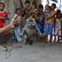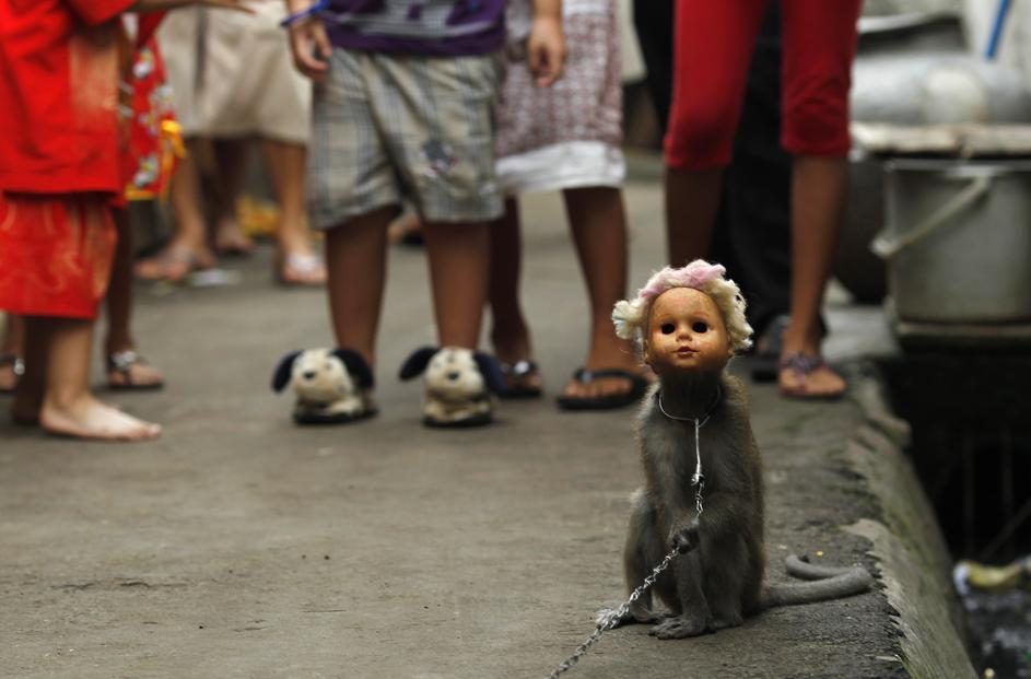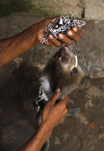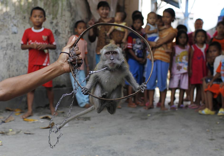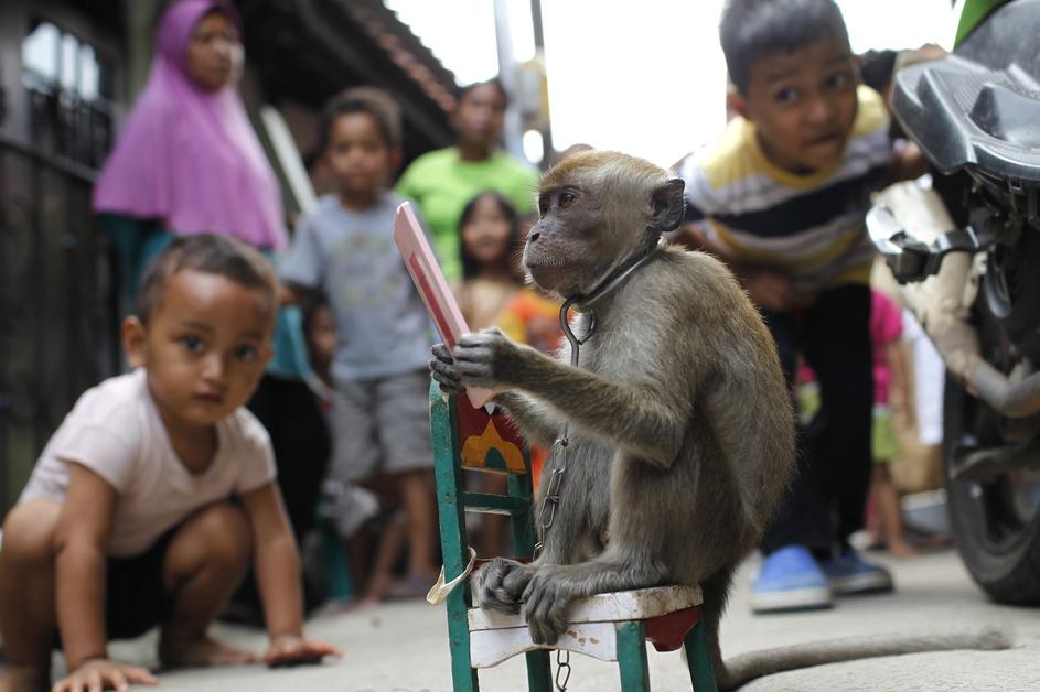 Karmini, lastnik štirih treniranih opic, pravi, da lahko z njihovo predstavo Opičja maska zaslužijo
