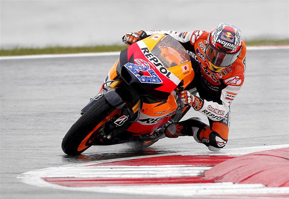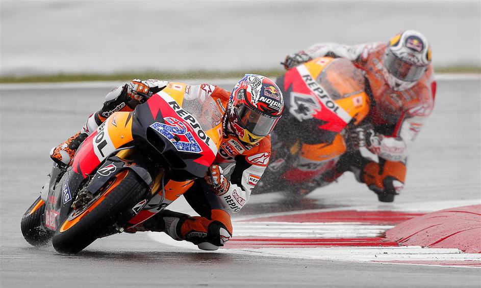Casey Stoner in Andrea Dovizioso (Honda) ter Jorge Lorenzo (Yamaha)