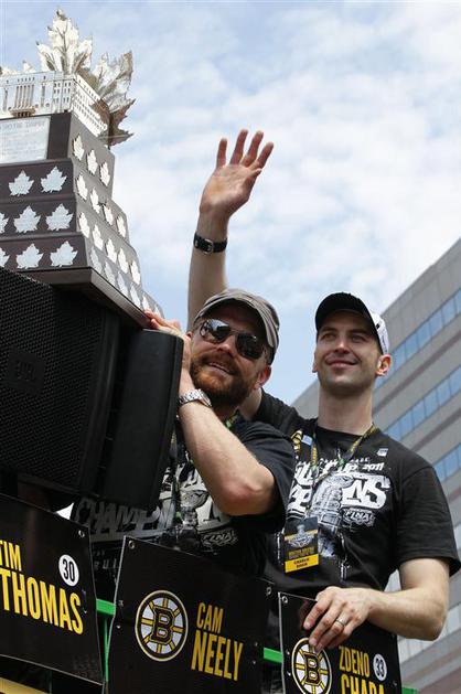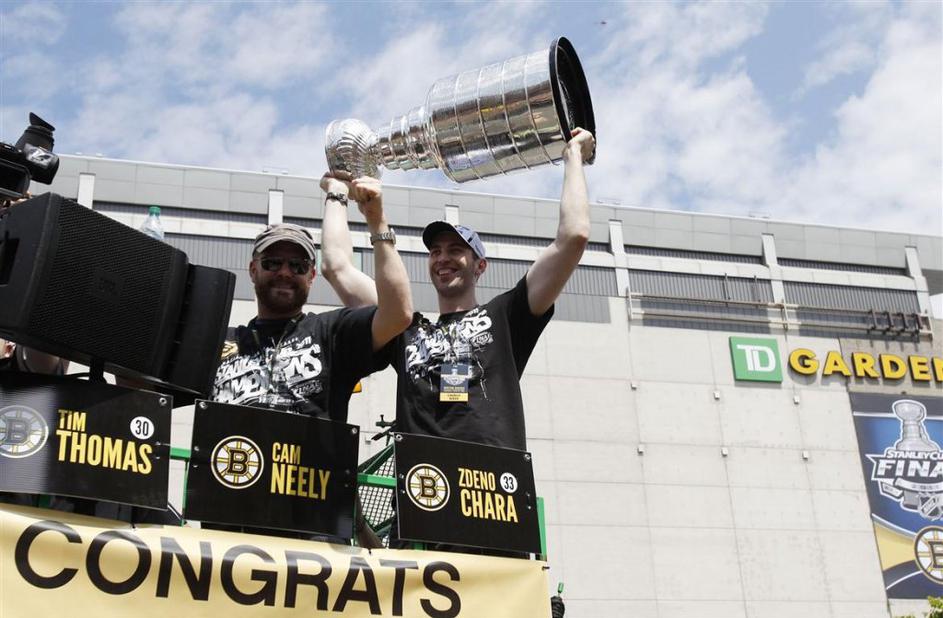 Tim Thomas in Zdeno Chara na bostonskih ulicah s Stanleyjevim pokalom.