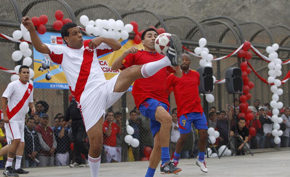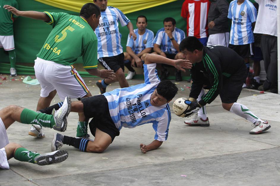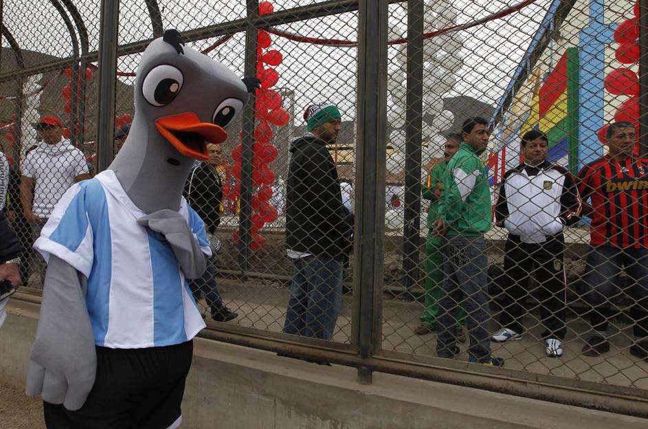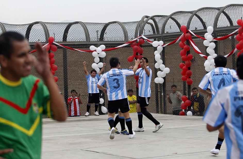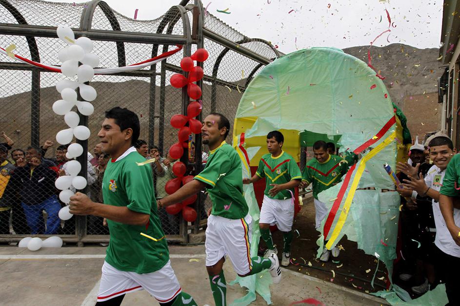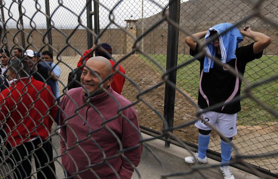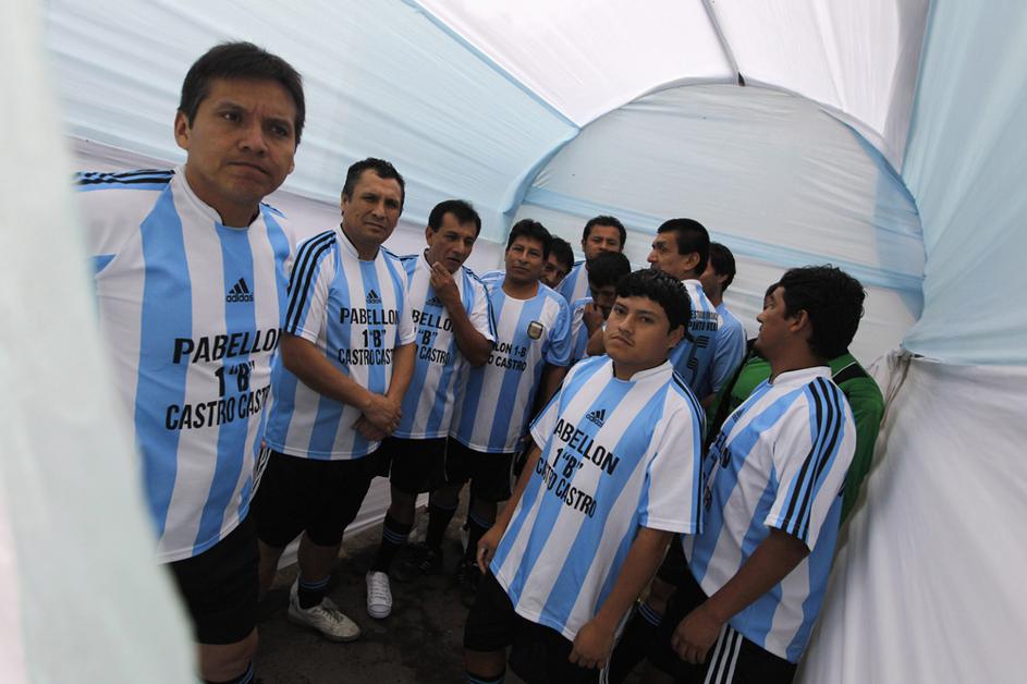 "Leo Messi" in druščina tik pred vstopom na igrišče, ki je postavljeno sredi zaporniškega kompleksa.