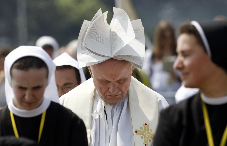 FotografijeMed obiskom papeža v Zagrebu se je eden od duhovnikov proti soncu boril kar s knjigo. Reuters