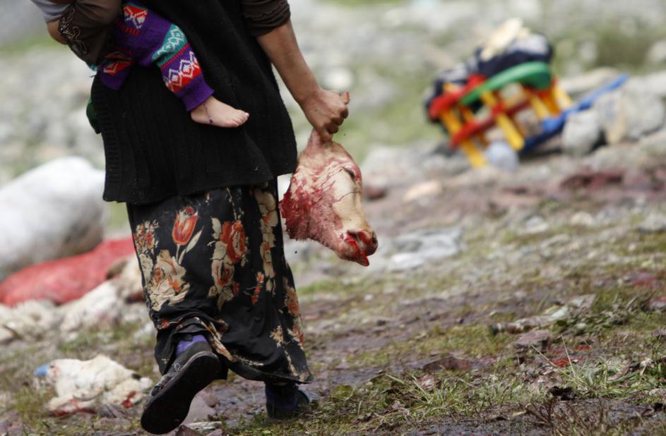 FotografijeŽenska iz Gruzije v eni roki nosi otroka, v drugi odrezano glavo ovce, ki so jo žrtvovali med verskim obredom. Reuters