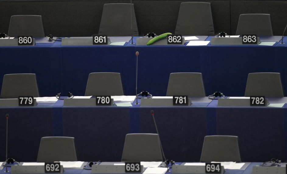FotografijeŠpanski evropski poslanec Francisco Sosa-Wagner je na svoji klopi v Evropskem parlamentu pustil kumaro – kot opozorilo, da kumare iz Španije niso vir okužb z bakterijo E.coli. Reuters