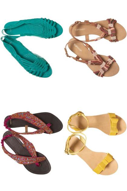 sandaliSandali. Za udoben korak izberite sandale brez pete. Najbolj modna različica ta hip so barviti gumijasti sandali, s katerimi greste lahko tudi v vodo. Topshop