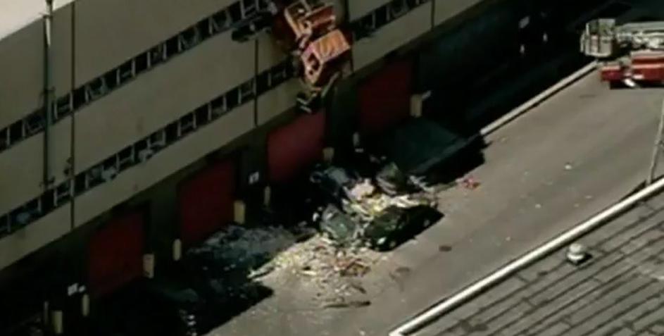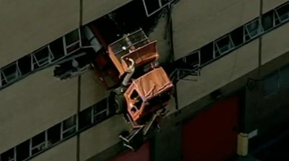 S tovornjakom obvisel v tretjem nadstropju