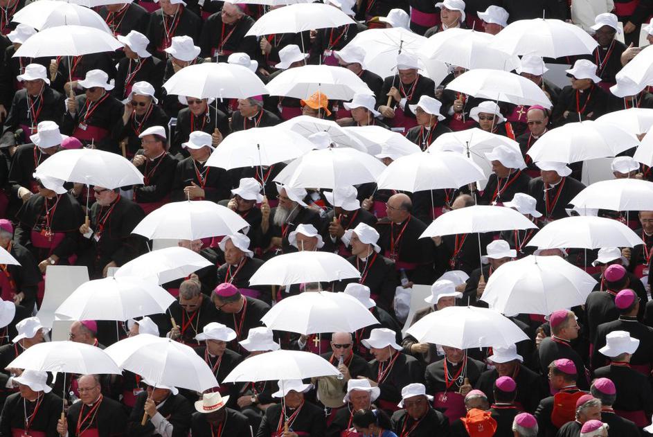 Med obiskom papeža Benedikta XVI. v Madridu je bila vročina res na višku. Škofi so senco iskali pod belimi dežniki.