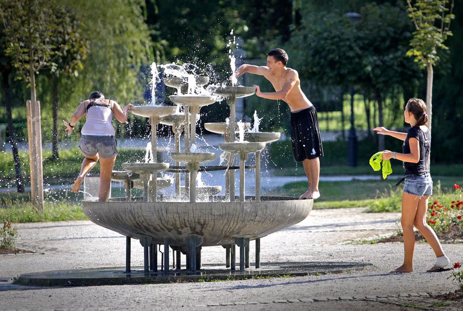 Gašper, Patricija in Maša so se včeraj hladili z vodo iz fontane v Tivoliju.