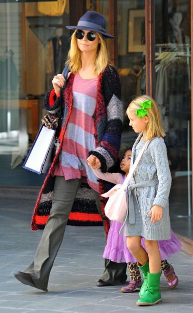 Heidi KlumHeidi Klum si skoraj nikoli ne privošči modnega kiksa, a tale oprava ji preprosto ne pristoji. Če bi se vsaj odločila za enobarven pulover brez črt ... Flynet