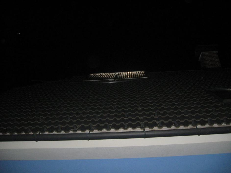 Enega od delov je sunek odnesel visoko na sosedovo streho, kjer je obtičal zataknjen za kolektorji. K sreči ni pristal nižje, saj je na tej strani hiše tudi okno.