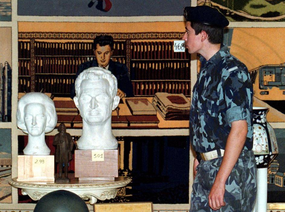Kiparski upodobitvi diktatorja Ceausescuja in njegove žene Elene - z dražbe leta 1999.