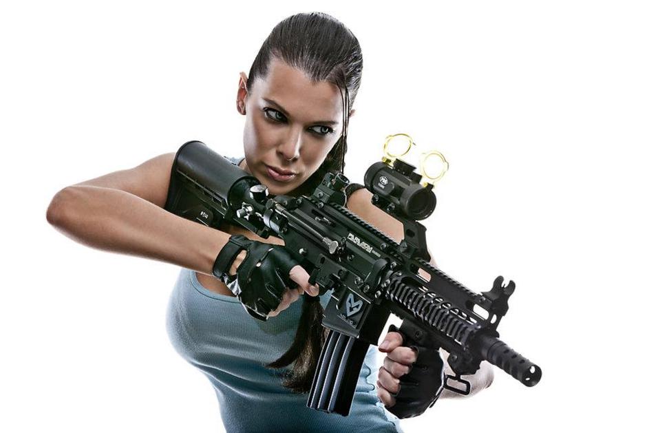 Iris zažiga na fotografijah, ki jih je posnela na snemanju oglasa za paintball puške ...