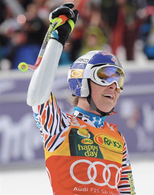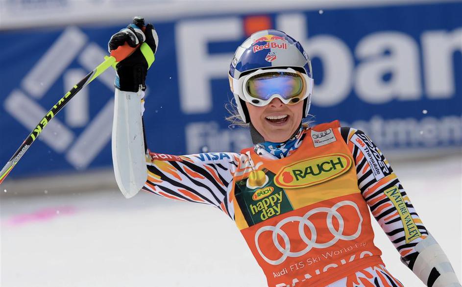 Zmagovalka Lindsey Vonn slavi v cilju.