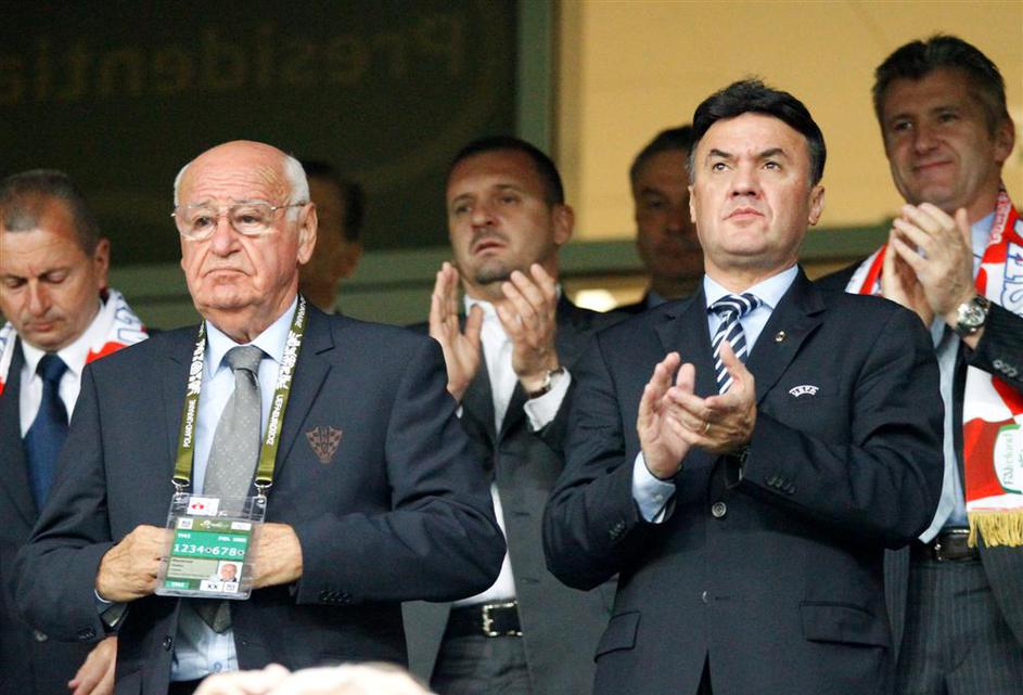 (Irska - Hrvaška) Predsednik hrvaške nogometne zveze Vlatko Marković (levo) z Davorjem Šukerjem in Predragom Mijatovićem (v ozadju).
