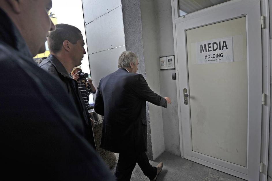 Pridržani Vladimir Vodušek na Info TV, kjer policisti opravljajo hišno preiskavo.