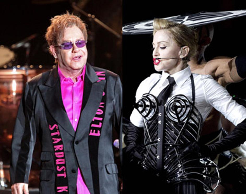 Elton John, MAdonna "Če bi imela Madonna le trohico zdravega razuma, bi se izogibala dance pesmim. Vendar ne, ona se mora dokazovati. Videti je kot sejemska striptizeta," je bil Elton John kritičen do svoje pevske kolegice Madonne. Reuters/EPA