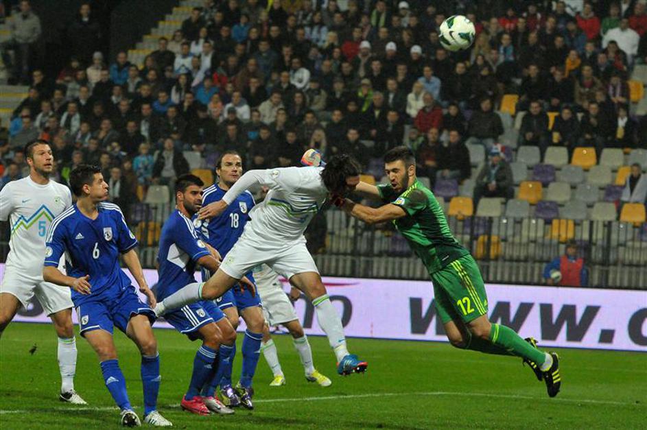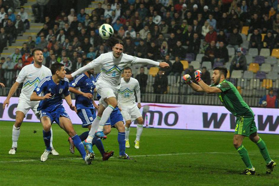 ... ciprski vratar Jorgalidis se je dobro pretegnil (Slovenija - Ciper).