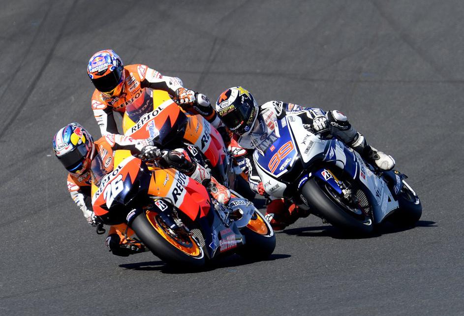 Troboj, ki je zaznamoval številne dirke v letošnji sezoni.: Pedrosa, Lorenzo in Stoner.