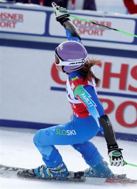 Tina Maze ob prihodu v cilj.