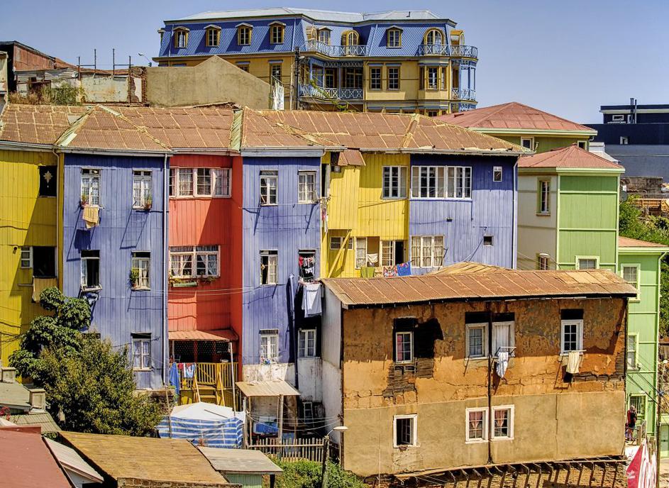 ValparaisoValparaíso, Čile. Pisane hiše so zaščitni znak mesta s pogledom na Tihi ocean. Tlakovane ulice obiskovalce popeljejo v pravi mestni labirint in presenečajo z živo arhitekturno dediščino. Znano je, da domačini svoje hiše barvajo z barvami, ki ostajajo od popravila ladij iz pristanišča. Shutterstock