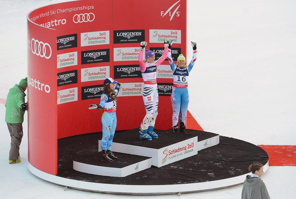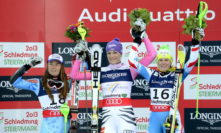 Zmagovalke: Tina Maze (levo), Maria Höfl-Riesch (sredina) in Nicole Hosp.