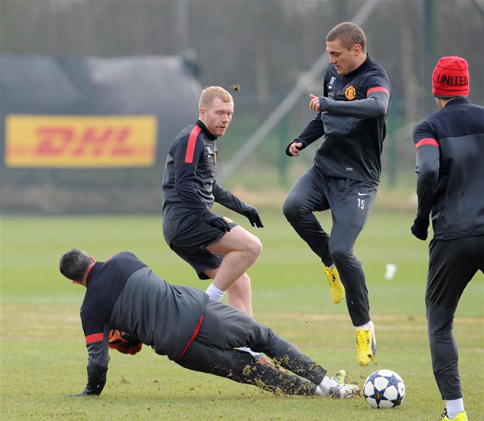 Van Persie (spodaj) ustavlja Nemanjo Vidića ob Paulu Scholesu (v ozadju).