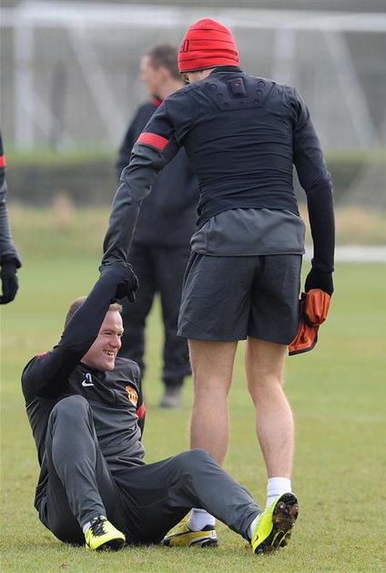 Wayne Rooney (spodaj) se je v Carringtonu več kot očitno dobro zabaval.