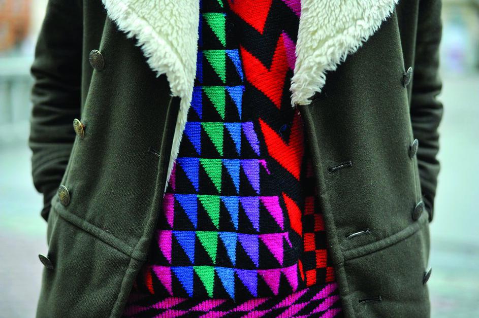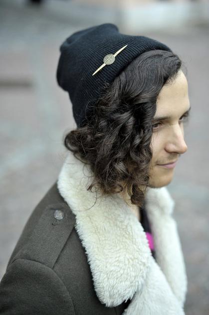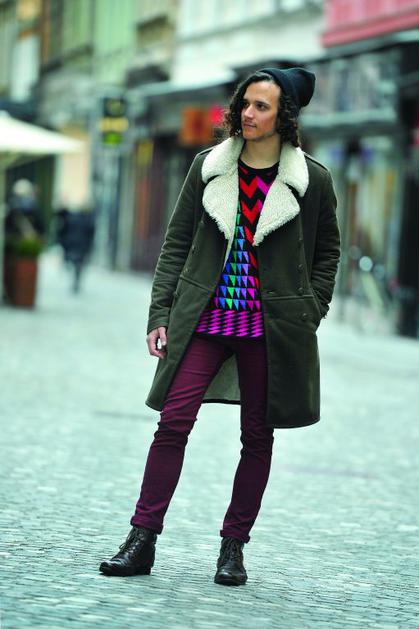 TajTaj, 22 let, študent. Nosi: hlače – H&M, pulover neznane znamke, kupljen v Londonu, plašč – Zara, čevlje – Topman, kapo in broško prav tako neznane znamke Anže Petkovšek