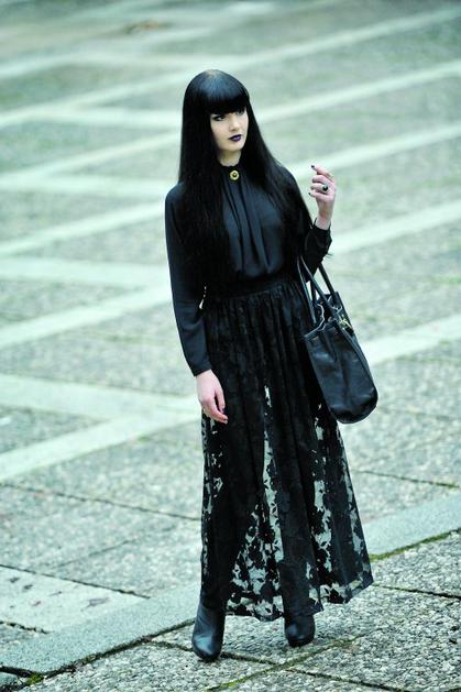 DianaDiana, 21, študentka. Nosi: čipkasto maksikrilo, bluzo in broško, vse vintage, plašč – Asos Anže Petkovšek