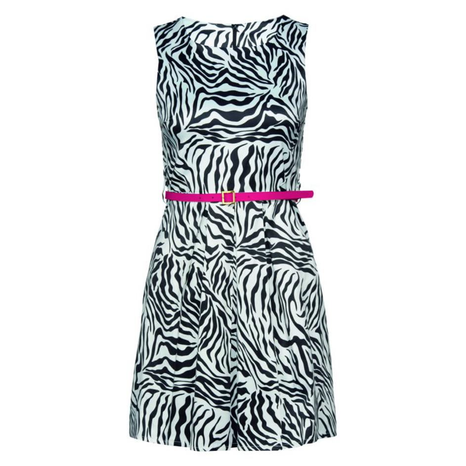 Zablestite v obleki s tropskim motivom.