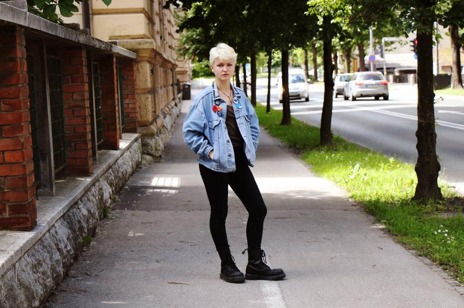 ulični stilUrša nosi hlače H&M, kupljene v Švici, olivno zeleno majico, očetovo jeans jakno znamke Benetton, čevlje Dr. Martens, kupljene na eBayu, ter značke, ki jih je izdelala sama. Natalija