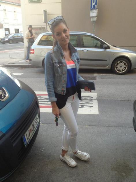 ulični stilSara nosi jeans jakno H&M, hlače Dsquared, majico Terranova, športne copate Converse All Star, torbico Armani Jeans in očala Ray-Ban. Natalija