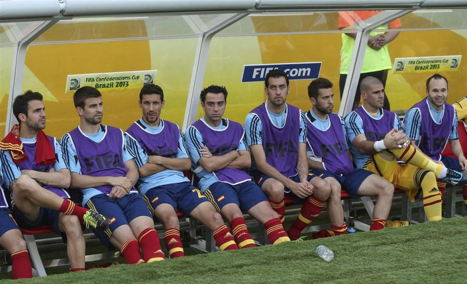 Xavi Iniesta Valdes Fabregas Alba Španija Tahiti pokal konfederacij Rio de Janei (Španija − Tahiti) Takšne klopi se ne bi branil noben trener na svetu. EPA Xavi Iniesta Valdes Fabregas Alba Španija Tahiti pokal konfederacij Rio de Janei