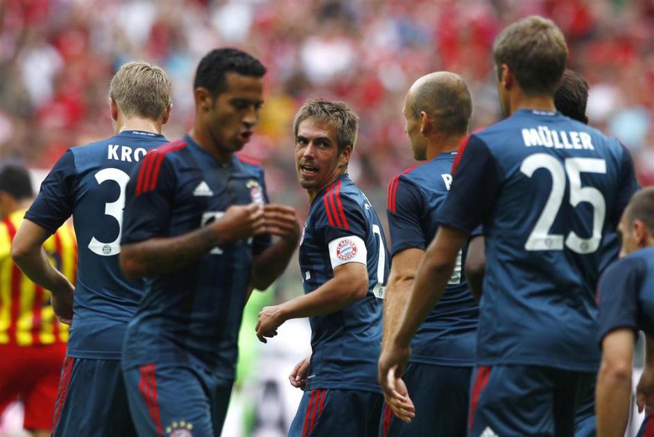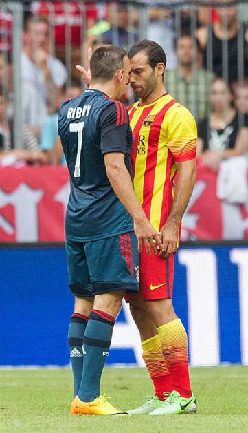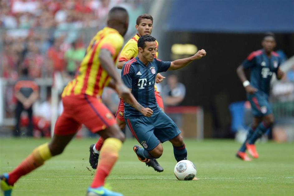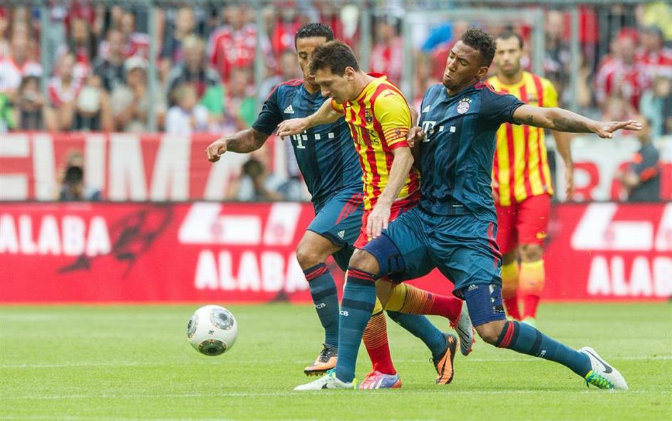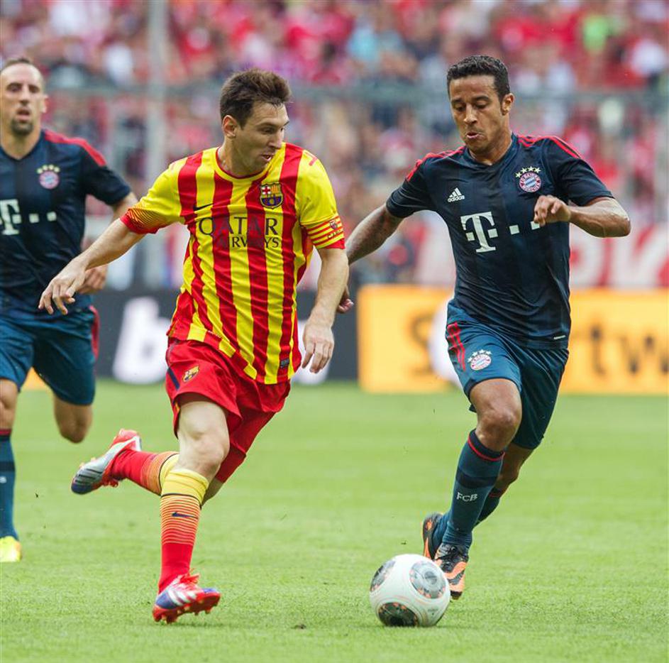 Messi Thiago Alcantara Bayern München Barcelona prijateljska tekma(Bayern München − Barcelona) Barcelona (levo Lionel Messi) je prvič igrala v novih dresih, ki jih krasijo barve katalonske zastave. Thiago Alcantara (desno) se je pomeril proti nekdanjim soigralcem. EPA
