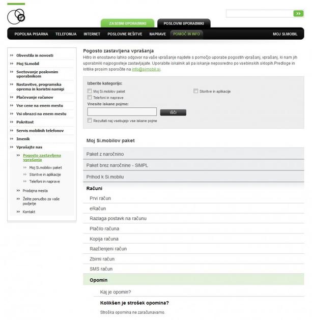 Na Simobilovi spletni strani je jasno zapisano, da za poslovne uporabnike velja cenik za "neplačane obveznosti" in ne opomini. Printscreen Simobil