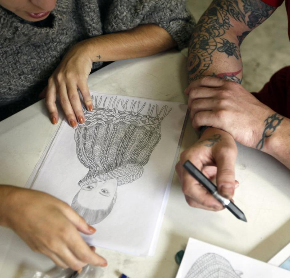 Oblikovalka in eden od njenih pletilcev.