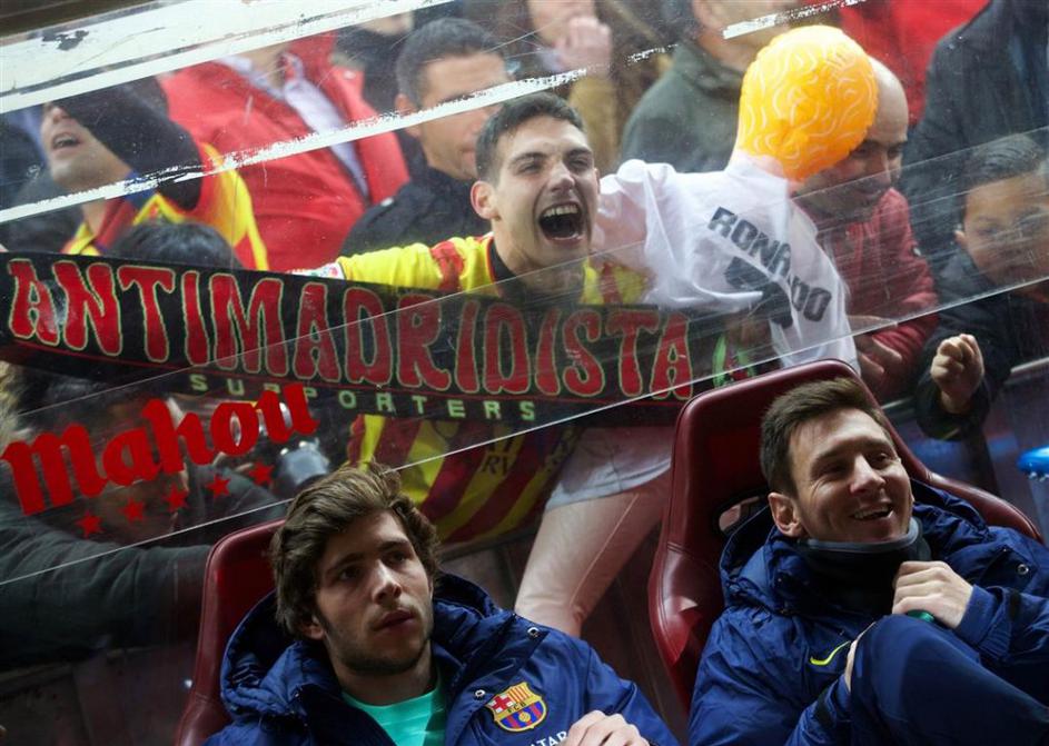 (Atlético Madrid – Barcelona) Gledalec, ki več kot očitno ni privrženec Real Madrida, pozira ob smehljajočem Lionelu Messiju, Sergiu Robertu in lutki Cristiana Ronalda.