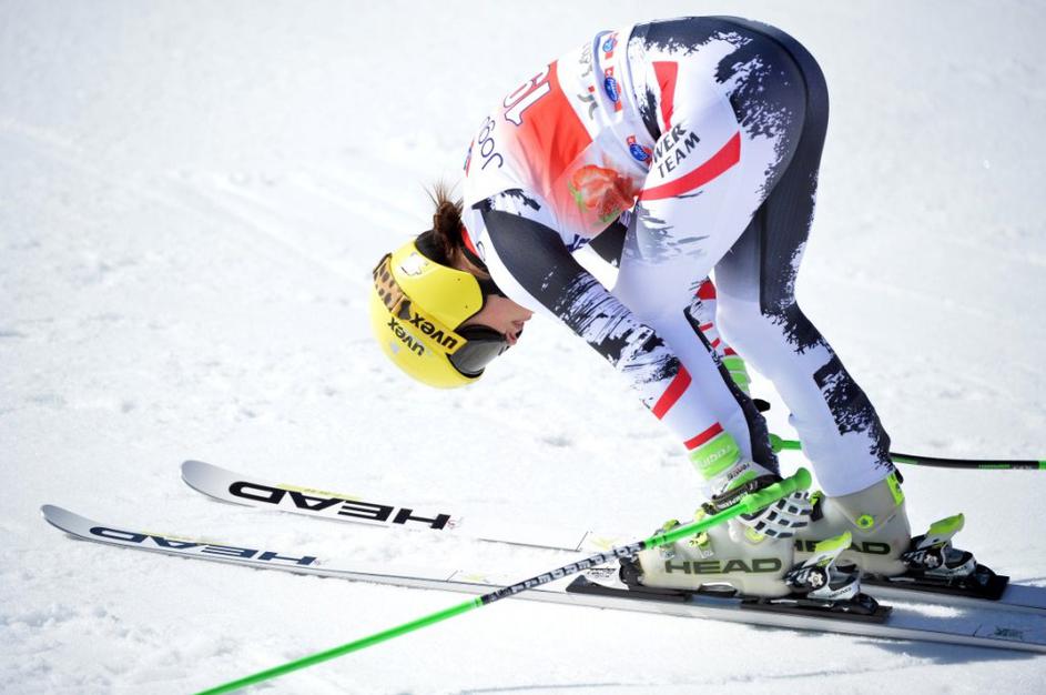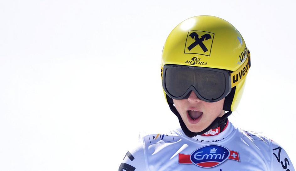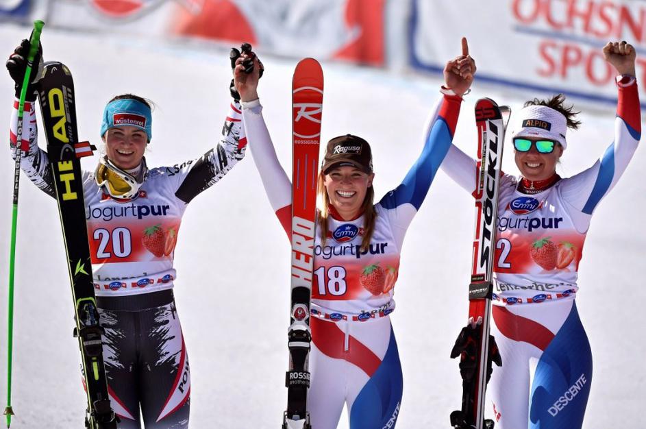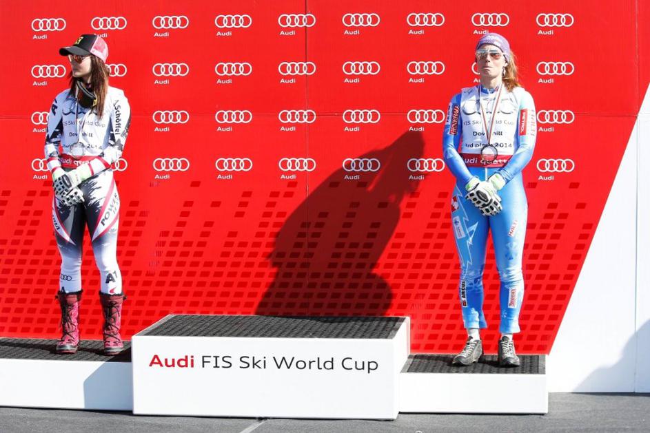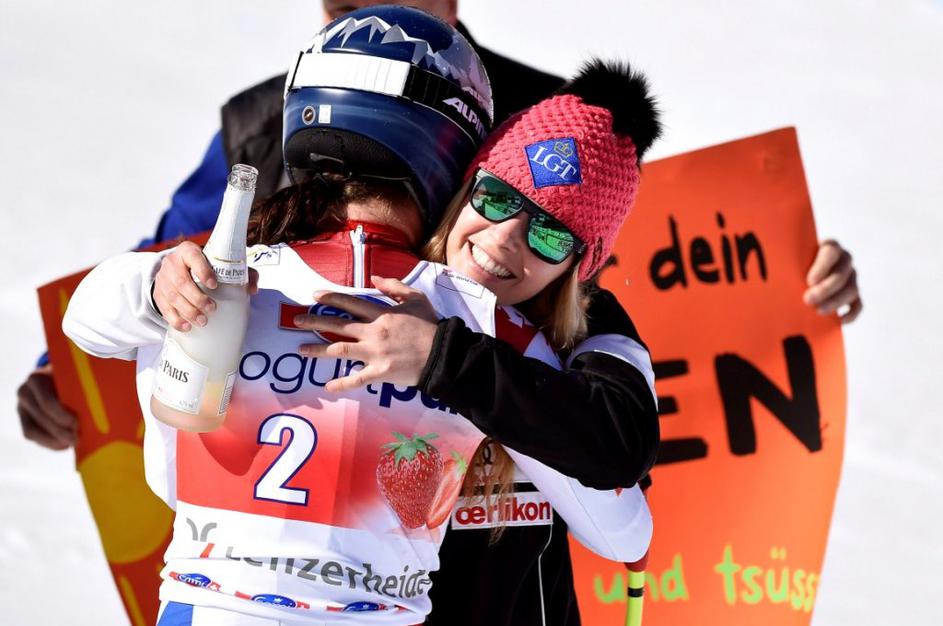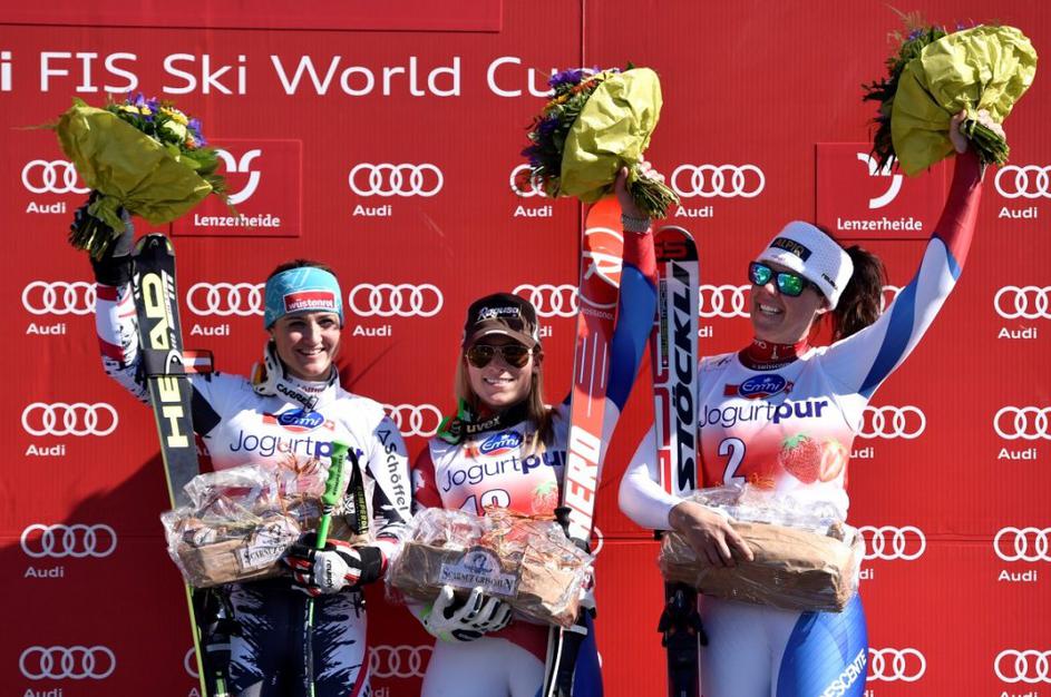 Aufdenblatten Gut Görgl Goergl svetovni pokal finale Lenzerheide smukNajboljši trojec je moral pozirati v cilju, medtem ko so Höfl-Rieschevi pomagali na progi. Ob Gutovi se je drugega mesta veselila Avstrijka Elisabeth Görgl (levo), tretja je bila še ena domačinka Fränzi Aufdenblatten. EPA